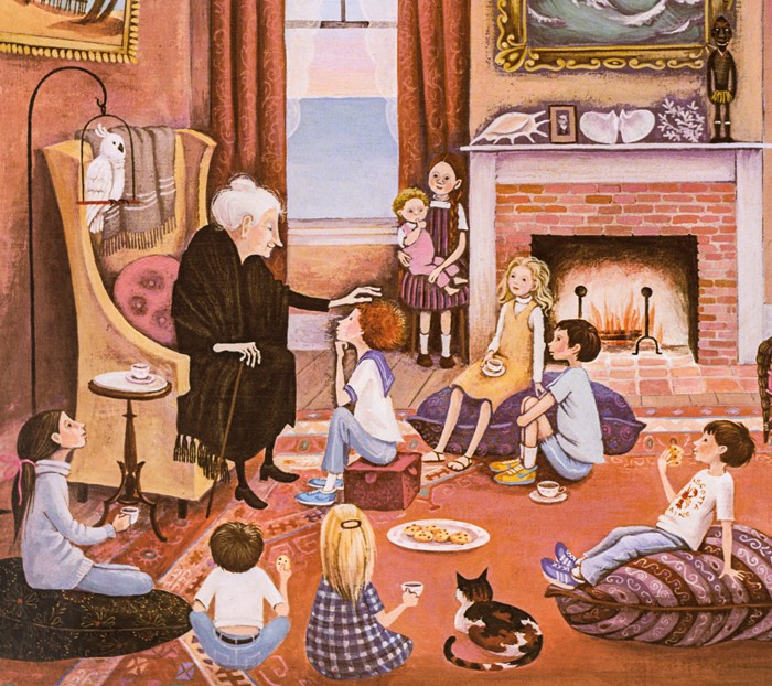 Now you might be asking yourself, what can be so wrong in a book about an old lady and lupines? This book is a perfect example of the whitewashing of the “American Dream”, the legacy of white saviorism in “travel” which most oftentimes masks for pure imperialization, and the mythology of safeness in a land where people of color, specifically indigenous folks, could not have the same outcome as Miss Rumphius. Her grandfather makes money carving “Indians out of wood to put in front of cigar stores” (not only the appropriating of the picture of an indigenous figure but of the capitalist whitewashing of Europeanized consumption and industry of tobacco). He also painted pictures of sailing ships and even though as we know I love boats and sailboats specifically, during this period, we know that they were vehicles to further global imperialization. And one of the three things he tells Alice to do is to travel which as I’ve written about in my past blog posts has deeper routes in how capitalist economies brutalize the global south. In the illustrations which are visually stunning and as I mentioned before, so nostalgic I almost feel like I’m peering into photographs of my own childhood, we can see moments that document the immorality of imperialization under the disguise of “travel.” While I appreciate in one of the pictures it is Bapa Raja giving her the shell instead of the white figure “giving” something to Bapa Raja, the picture is still a classic example of the global divide created by neoliberalism and white supremacy.