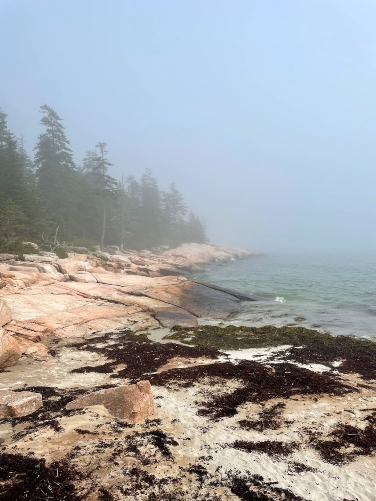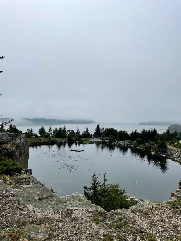 Next, I went to Sand Beach which required a journey of weaving through a densely green forest. When I arrived it wasn’t tropical like I imagined but blanketed in that same morning fog. I dove into the colder water and realized I wanted to stay in forever. I climbed onto rocks and jumped off like I was a little child. Swimming at a mysterious beach at the edge of the world all by yourself gives you a sense of freedom that is indescribable. I headed back and eventually after a long wait made it onto the very end of the ferry. As I waited at the cove’s edge I couldn’t help but ponder about the places I wondered, reaching farther than the sight of my binoculars. Swan’s Island is beyond beautiful. But perhaps more than that I was enchanted by this idea of my movie fantasy melding into my present reality. As I sat on a rock with the icy water lapping onto my feet I wondered where that mystical fantasy even ends when places like this really exist in the supposed real world. Real-world creations of realities that exclude such beauty seem to me, more made-up than a world full of this much wonder. Why do we live in a construct so devoid of this beauty and call it real life when a made-up world full of true allurement actually exists? But then I remember that I am just a visitor here. I am not a resident whose ancestors lived on this land for centuries only to be brutalized by the hands of European imperialism. I am not the daughter of a lobsterman who does not have enough money for school supplies. This brought me back to the quote I included in my presentation on lighthouses: